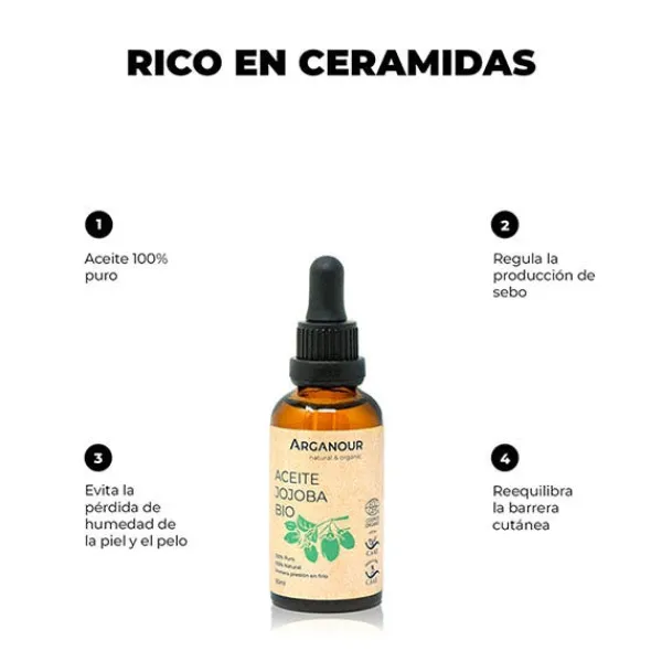 El aceite de jojoba penetra y disuelve dichos depósitos, regula la secreción sebácea excesiva en el cuero cabelludo y estimula su crecimiento, lo que te hará tener un cabello más abundante y sano.