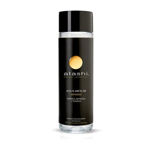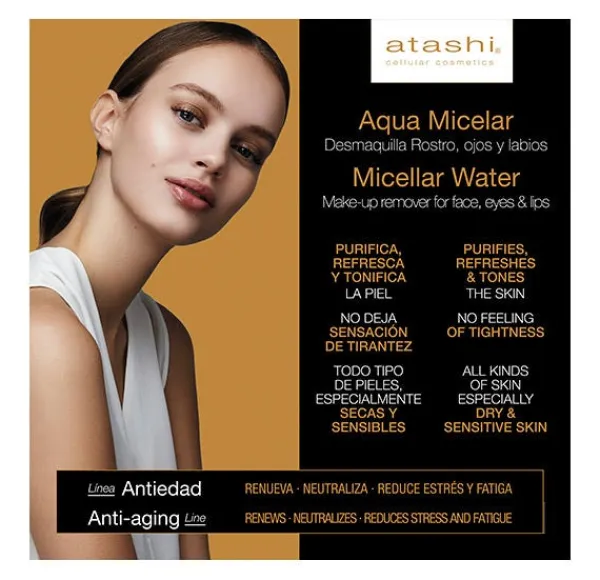 El aqua micelar atashi cellular cosmetics es un desmaquillante para el rostro, ojos y labios de las pieles más sensibles y secas.
