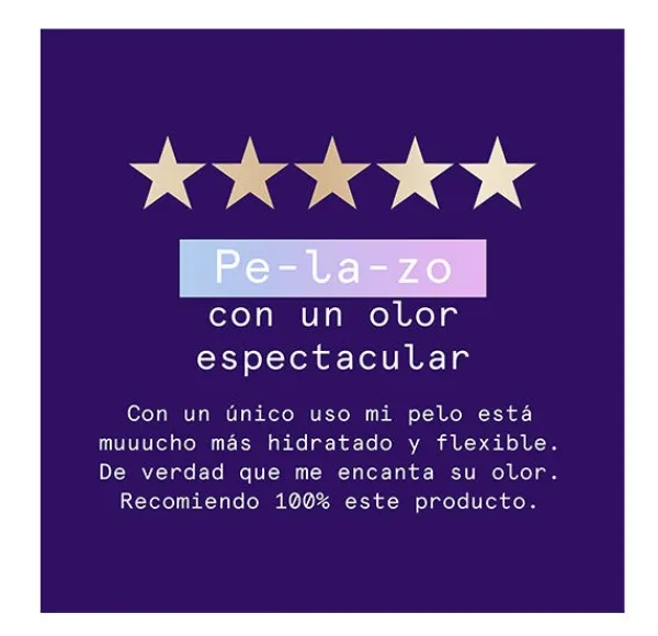 Mascarilla capilar con un 95 % de ingredientes naturales (mezcla de un 87 % de agua purificada de origen natural y un 8 % de ingredientes derivados naturales, el 5 % restante se dedica a una buena experiencia de uso y producto).