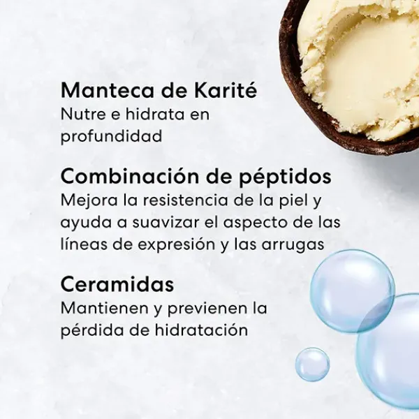 Enriquecida con manteca de karité, esta hidratante facial, refuerza las barreras naturales de la piel y su luminosidad. La mezcla de péptidos veganos, ceramidas y aminoácidos suaviza la textura áspera del rostro y reducen el aspecto de las líneas finas y arrugas.