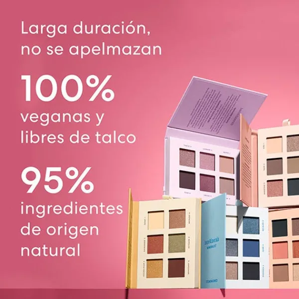 Paleta de sombras de ojos vegana y sin talco que incluye 6 sombras intensamente pigmentados y ultra difuminables con distintos acabados.