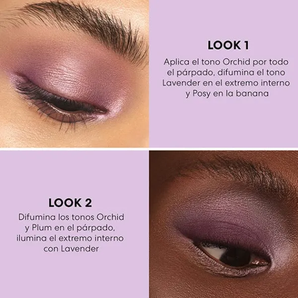Distintos acabados: 3 mates aterciopelados, 2 satinados luminosos y 1 metálico brillante. Duran todo el día sin apelmazarse. Texturas cremosas que permiten difuminar, mezclar y superponer.