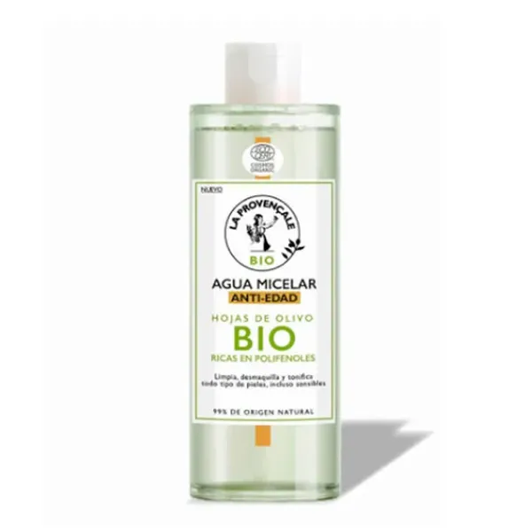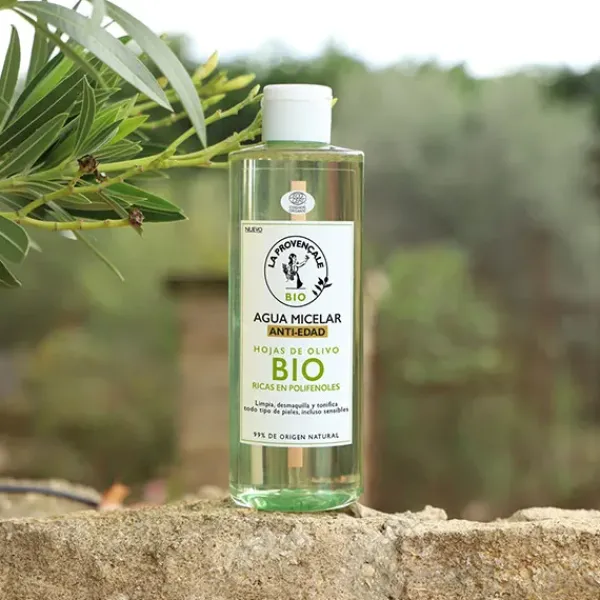Enriquecida con extracto de hojas de olivo BIO, rico en polifenoles, el Agua micelar antiedad de la Provençale Bio limpia y tonifica la piel sin resecarla, eliminando suavemente impurezas y restos de maquillaje de rostro, ojos y labios.