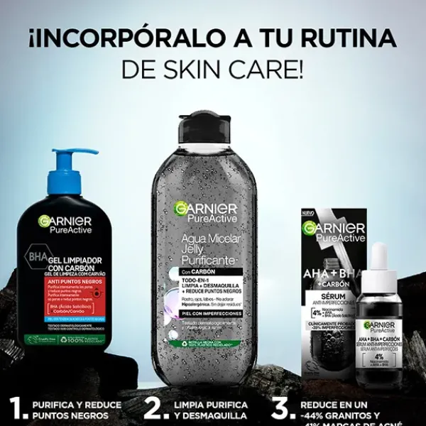 Garnier Pure Active Gel Limpiador Anti Puntos Negros enriquecido con BHA (Ácido Salicílico) y Carbón de origen natural, purifca la piel, reduce granitos y puntos negros y previene su reaparición para una piel limpia y matificada.