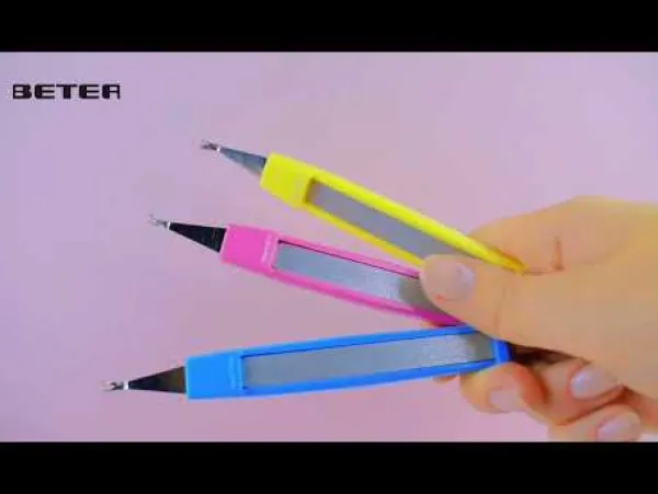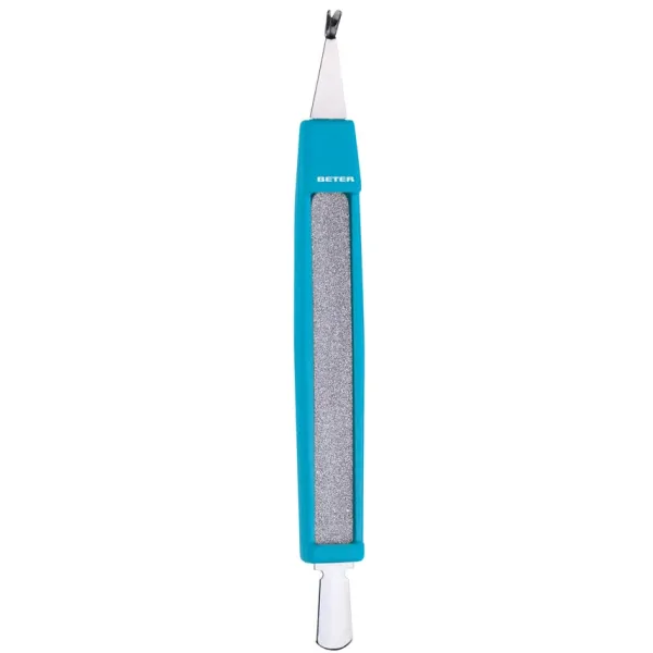 Un Dúo muy práctico. Por un lado elimina las cutículas y por el otro lima las uñas.