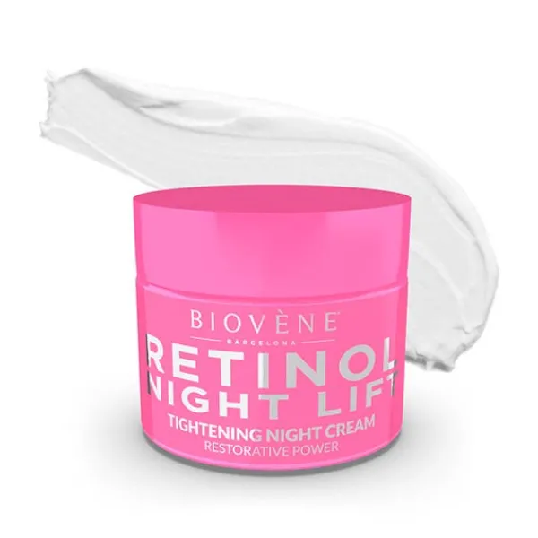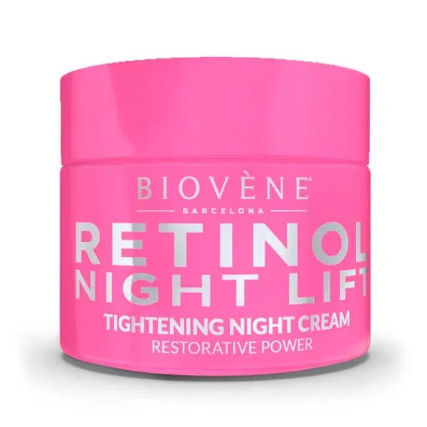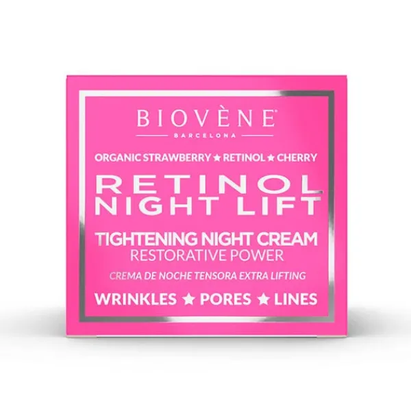 La crema de noche NIGHT LIFT hidratante tensora de noche con potente retinol y fresa orgánica restaura la firmeza y ayuda a minimizar la apariencia de las líneas finas.