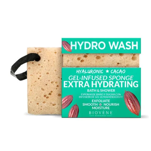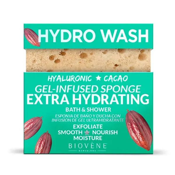 Esponja de baño y ducha multifuncional ultrahidratante infundida con ácido hialurónico intensamente hidratante, cacao y aceite de semilla de uva que nutre, exfolia y suaviza la piel al instante.