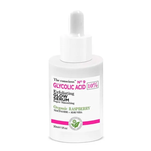 The conscious sérum facial de noche transformador de la piel con ácido glicólico exfoliante, niacinamida y hojas de frambuesa orgánica elimina las células muertas acumuladas y los poros para ayudar a reducir la apariencia de los signos del envejecimiento para una piel suave, renovada y radiante.