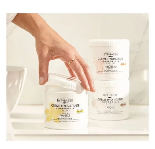 La CREMA HIDRATANTE CORPORAL CON ACEITE DE ALMENDRA DULCE en formato 500 ml, formulada con glicerina, manteca de karité y enriquecida con vitamina E, hidrata la piel.