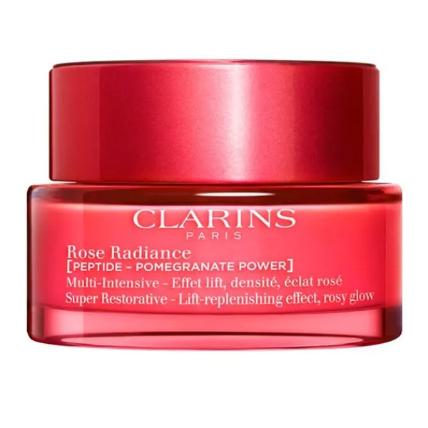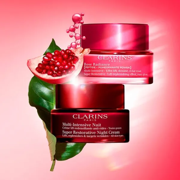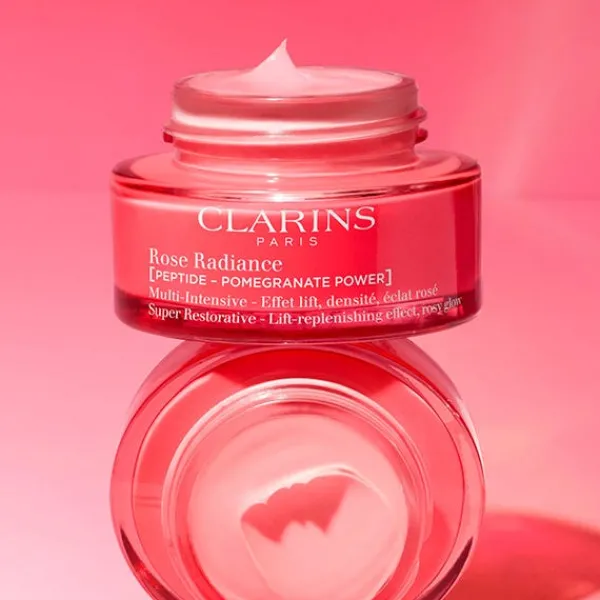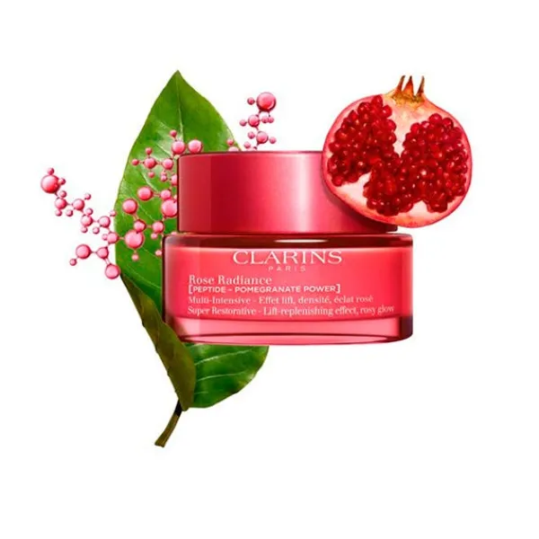 Clarins tambien ha combinado los extractos de la Harungana Bio, la alternativa de la naturaleza al retinol que multiplica x12 la síntesis de colágeno. Junto con el extracto de argoma bio, con una acción redensificante que combate el relajamiento cutáneo. Juntos forman un potente duo redensificante y reafirmante que deja la piel más lisa, radiante, rellena y uniforme. Compuesta con un 93% de ingredientes de origen natural, Multi Intensiva Rose Radiance ofrece una textura envolvente de alta sensorialidad.