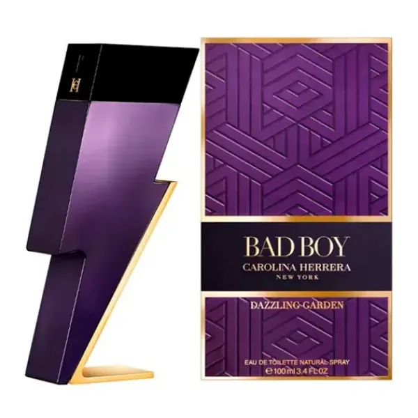 El frasco de la fragancia Bad Boy Dazzling Garden se presenta en un elegante estuche morado y dorado, que refleja los atrevidos tonos de esta edición especial para coleccionistas.