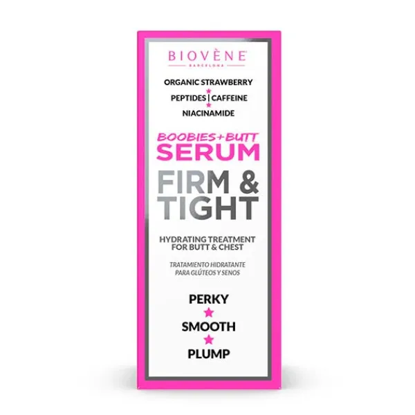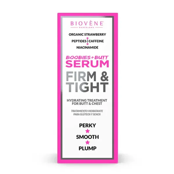 Tratamiento de suero ultrahidratante para glúteos y senos con fresa orgánica, péptidos, cafeína y niacinamida para ayudar a mantener una apariencia más firme y tersa y brindar una suavidad sensual con una sensación de volumen y vitalidad.