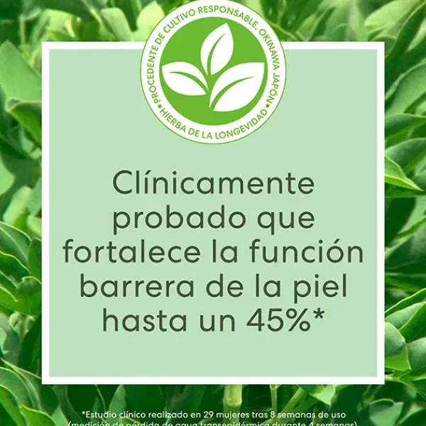 El secreto de este sérum es la Hierba de la Longevidad – ahora potenciada con trehalosa para una mayor eficacia – combinada con niacinamida y amapola californiana, potentes extractos botánicos. Con más vitaminas y minerales que la espinaca o el kale, la Hierba de la Longevidad lleva siglos formando parte de la dieta local de los habitantes de Okinawa en Japón, donde los habitantes viven más que en cualquier otro lugar. Este superalimento rico en minerales se cosecha de forma responsable sin usar productos químicos, pesticidas o fertilizantes.