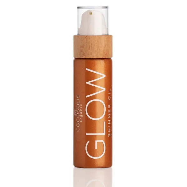 Aceite natural seco iluminador GLOW Shimmer Oil con partículas brillantes e ingredientes naturales orgánicos.