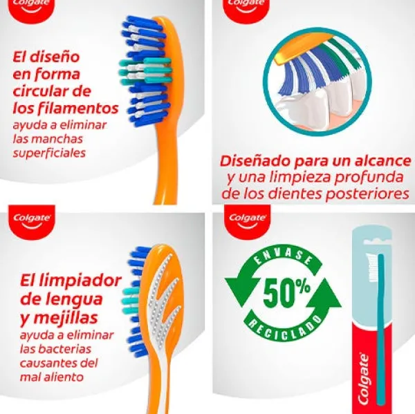 Colgate Triple Action es un cepillo de dureza media. Limpia los dientes. Elimina las manchas de la superficie de los dientes.