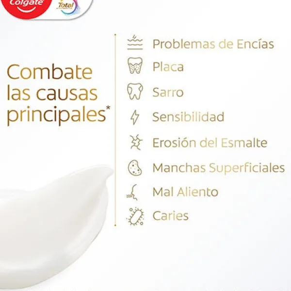 Además de limpiar los dientes, la tecnología preventiva, patentada² y eficaz de la pasta Colgate Total Prevención Activa Original ayuda con 8 problemas de salud bucal: