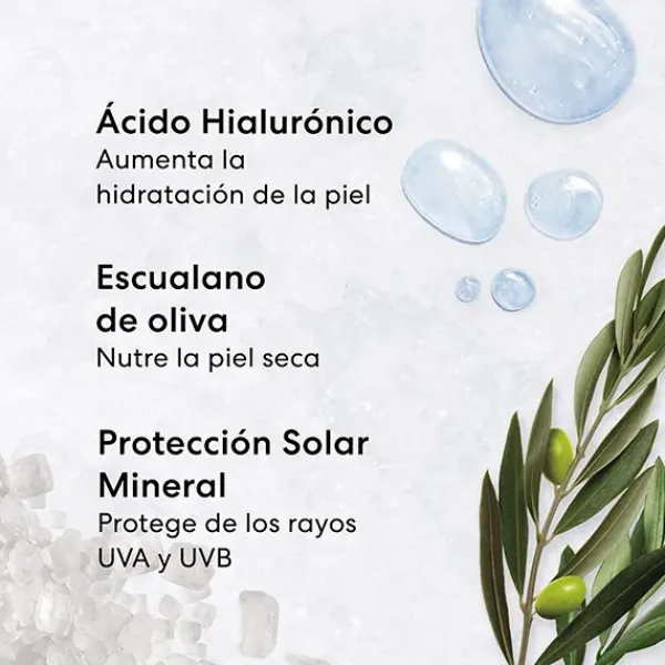 Su fórmula con tratamiento, compuesta por ácido hialurónico y escualano de oliva, aumenta la hidratación de la piel hasta un 215% en tan sólo 1 semana.** Sin aceites y rica en agua – 98% de origen natural- se extiende sobre la piel dejando el rostro con un aspecto fresco, saludable y natural.