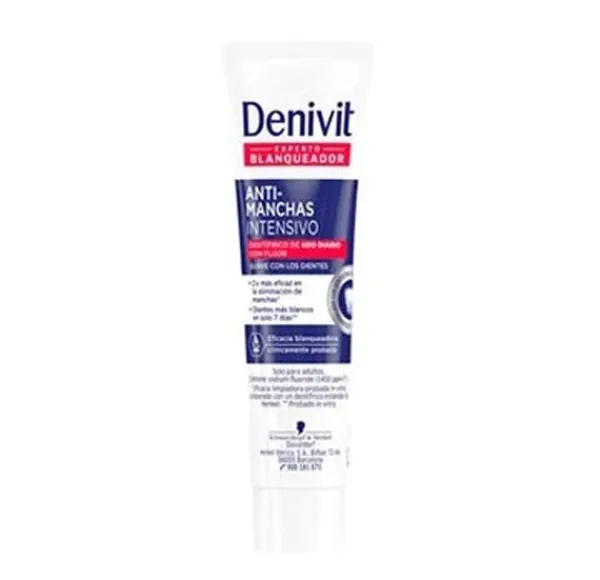 DENIVIT elimina de forma eficaz las manchas y coloraciones de los dientes causadas por la comida, bebida y tabaco. Por ello, está especialmente recomendado para fumadores, bebedores de café y vino, así como cualquier persona que desee conseguir unos dientes más blancos. Puede usarse a diario, su fórmula contiene ingredientes suaves y eficaces que no dañan el esmalte dental. Además, elimina las manchas suavemente sin utilizar ingredientes agresivos con los dientes ni blanqueadores químicos.