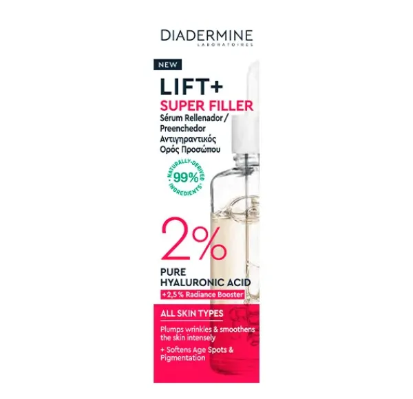 – 2% Ácido Hialurónico Puro: para rellenar las arrugas desde el interior, alisar e hidratar la piel.