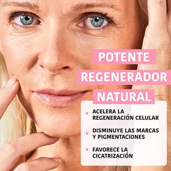 Entre sus activos está la Rosa Mosqueta, tiene un enorme poder contra los radicales libres causantes del envejecimiento cutáneo, por ello es un potente producto antiedad que atenúa las arrugas y líneas de expresión aumentado a la vez la firmeza y elasticidad de la piel. Además, tiene un efecto regenerador de la piel lo que ayuda a disminuir marcas y cicatrices del rostro.