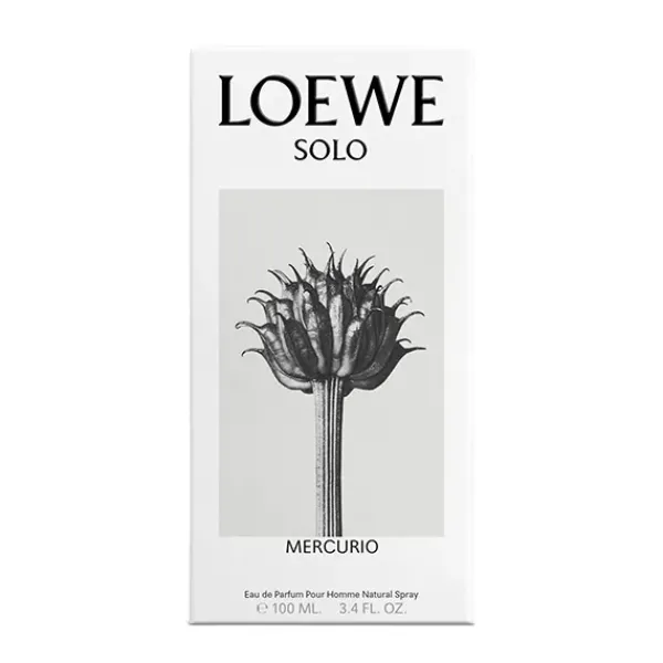 LOEWE Solo Mercurio es el primer Eau de Parfum de la familia LOEWE Solo, una fragancia profunda y misteriosa diseñada a base de acordes contrapuestos perfectamente equilibrados con hoja de higuera, tabaco miel, ámbar y nerolí.