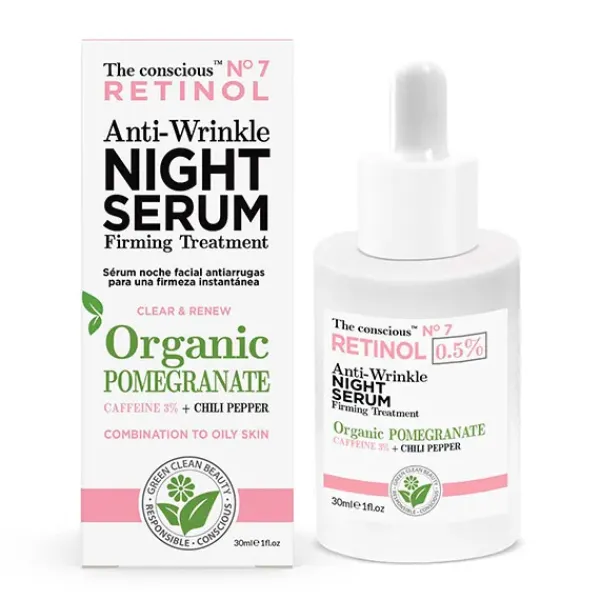 The conscious sérum facial reafirmante renovador de la piel con retinol, aceite de granada orgánico y cafeína para ayudar a mejorar la textura de la piel y minimizar la apariencia de líneas finas y arrugas para una piel rejuvenecida, firme y clara.