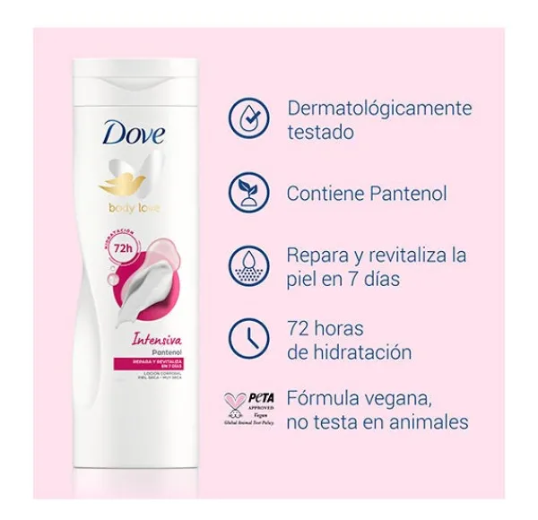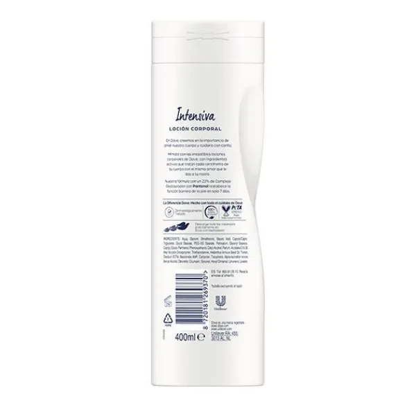La loción corporal de Dove Intensiva contiene la exclusiva tecnología DeepCare complex que consiste en una combinación única de nutrientes naturales de la piel y rico aceite esencial que ayuda a mejorar la piel en profundidad.