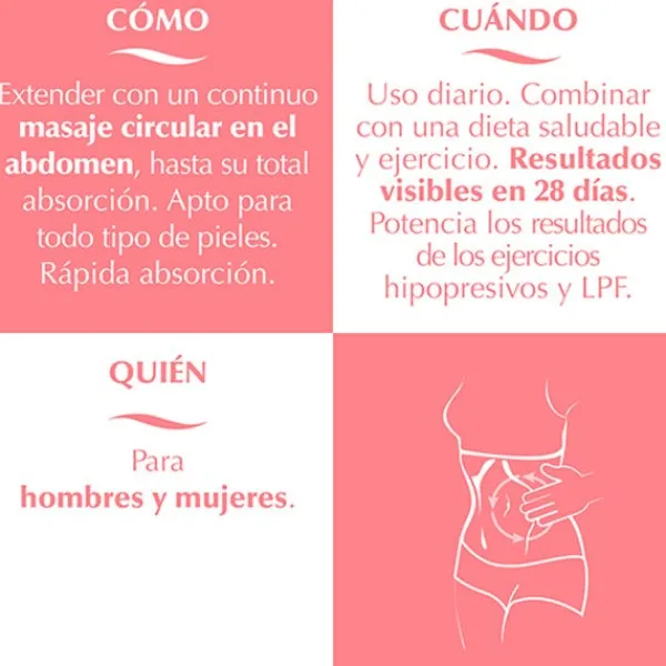 Al mismo tiempo que hidrata y reafirma el abdomen. Vientre Plano Intensive es ideal para preparar el cuerpo antes de una actividad deportiva ya que potenciarás así su efecto reductor y los resultado de la práctica de hipopresivos o Low Pressure Fitness (LPF).