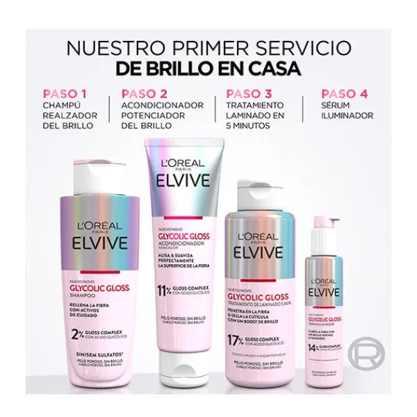 L’Oréal Paris Elvive Glycolic Gloss – Tratamiento de Laminado es la solución Tratamiento brillo capilar 5 minutos. En solo 5 minutos, este revolucionario tratamiento penetra en la fibra capilar, sella la cutícula y proporciona un impulso de brillo que te dejará asombrada.