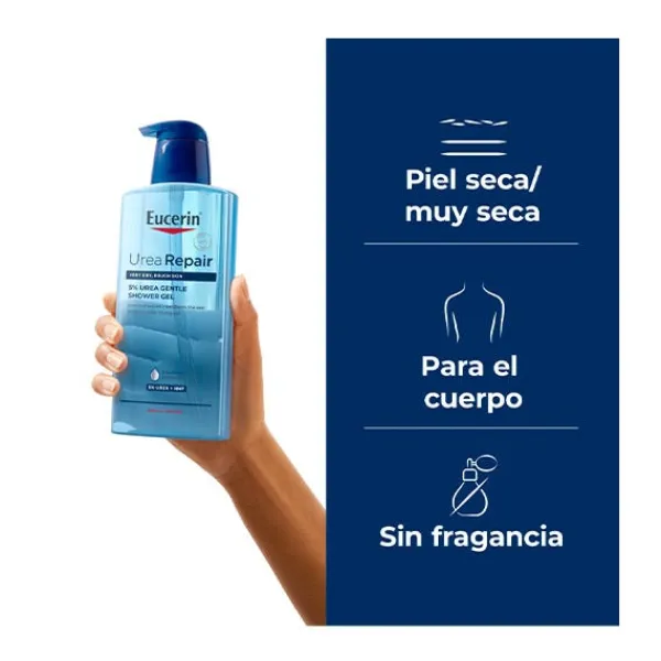 UreaRepair Gel de Ducha Suave 5 % Urea limpia y exfolia la piel seca y áspera con mucha suavidad a la vez que preserva la barrera natural de la piel y protege la piel de la sequedad.