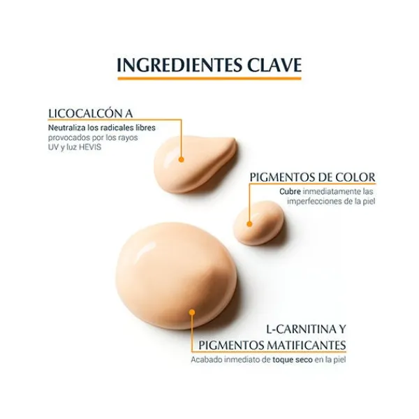 > Con pigmentos de color para un doble efecto: cobertura inmediata de las imperfecciones de la piel y proporciona protección frente la luz visible de alta energía (HEVL).