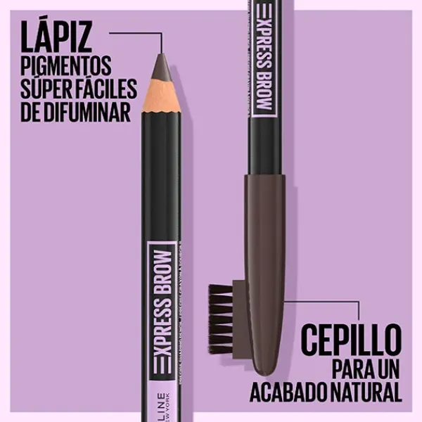 Rellena y define tus cejas de la forma más rápida, natural y sin necesidad de ser una experta con el nuevo lápiz de cejas de Maybelline Express Brow Shaping Pencil y su cepillo para difuminar y peinar.