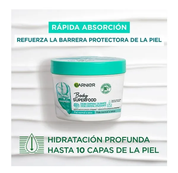 Garnier Body Superfood Crema Corporal Calmante con Aloe Vera y Magnesio para Pieles de Normales a Secas. Penetra hasta 10 capas de la epidermis calmando la piel y reforzando su barrera protectora. Crema de absorción rápida hidratante 48h.