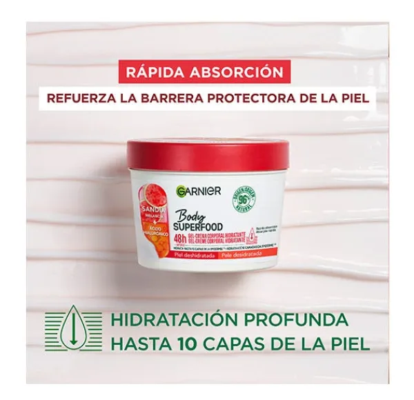 Garnier Body Superfood Crema Corporal Hidratante con Sandía y Ácido Hialurónico Para Pieles Deshidratadas. Penetra hasta 10 capas de la epidermis hidratando y reforzando la barrera protectora de la piel. Crema de absorción rápida hidratante 48h.