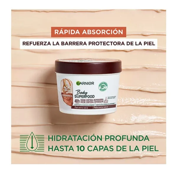 Garnier Body Superfood Crema Corporal Reparadora con Cacao y Ceramida para pieles extra secas. Hidrata hasta 10 capas de la epidermis reparando y reforzando la barrera protectora de la piel. Crema de absorción rápida hidratante 48h.
