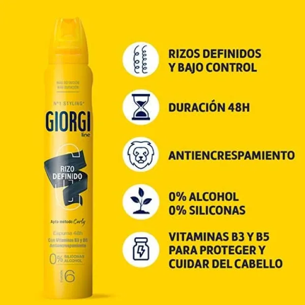 Prueba la Espuma Rizos Definidos Control 48h de Giorgi, la espuma para definir y controlar incluso los rizos más rebeldes durante más tiempo y sin encrespamiento gracias a sus activos acondicionadores, durante 48 horas. Con Vitaminas B3 y B5 que protegen y cuidan el cabello para que luzca hidratado, brillante y suave.