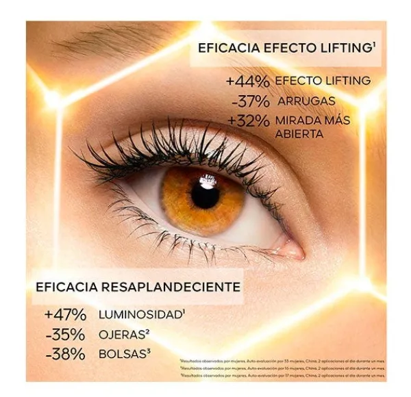 La mirada se ilumina intensamente, el contorno de los ojos se alisa, las bolsas y las ojeras se reducen visiblemente y las irregularidades de color de la mirada se atenúan.