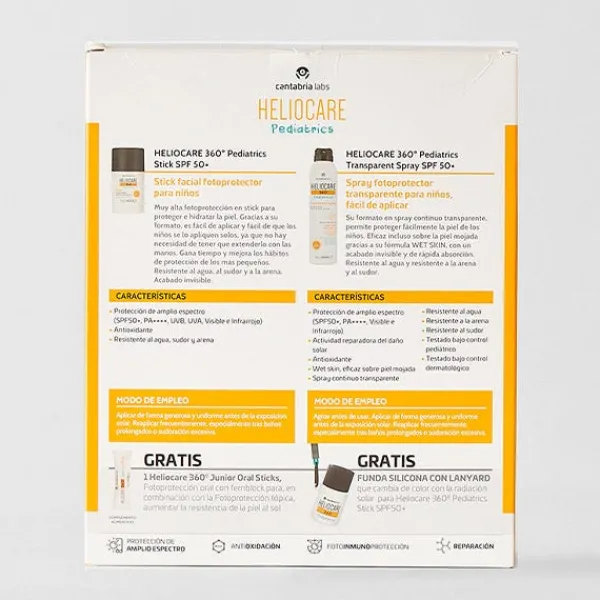 Este pack incluye un stick facial SPF50+ para proteger la piel sensible de los niños en zonas expuestas (rostro y cuello), un spray corporal SPF50 para fotoprotección de amplio espectro, una muestra de stick oral y un práctico lanyard que cambia de color con la radiación solar.