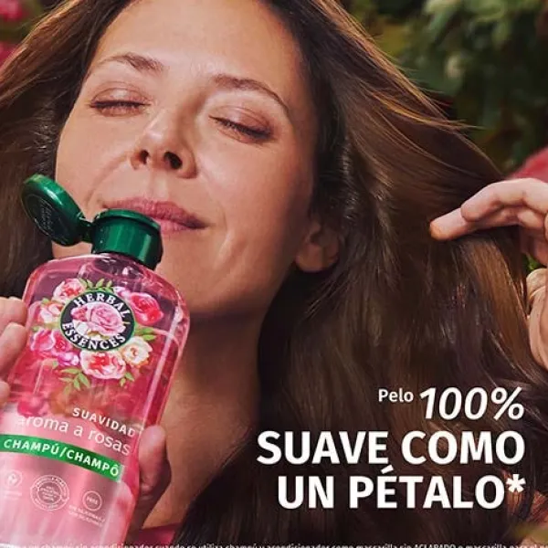 Prepárate para días de color de rosa. Herbal Essences Champú Suavidad Aroma a Rosas ayuda a trasformar el pelo seco en un pelo rico y sedoso. Déjate envolver en su fragancia floral. Al mezclar nutrientes de origen vegetal infusionados con esencia de rosa auténtica, cosechada a mano en Grasse, en el sur de Francia, obtenemos una fórmula vegana y sin siliconas que forma una dulce espuma para una limpieza y profunda hidratación del pelo seco