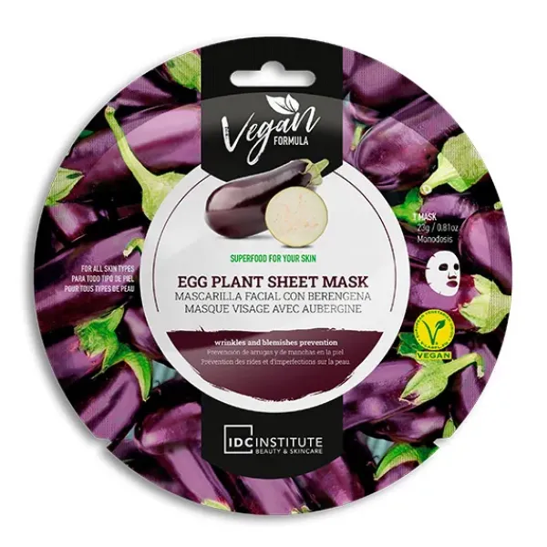Mascarilla vegana en formato papel impregnado con berenjena para prevenir arrugas y manchas en la piel.