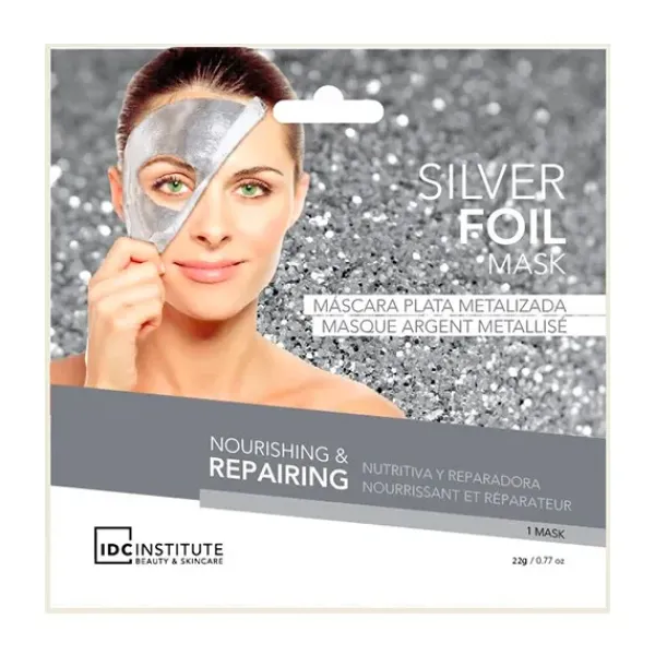 Mascarilla plata metalizada nutritiva y reparadora que contiene ácido hialurónico y un increíble cóctel de extractos naturales de plantas muy ricas en propiedades antioxidantes, reparadoras y calmantes.