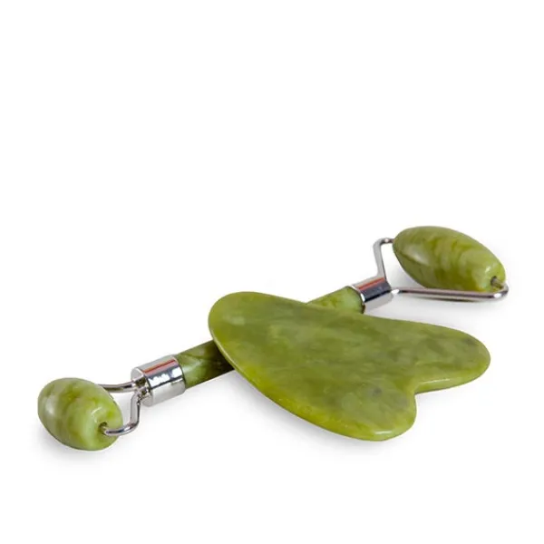 Set de masaje compuesto por un masajeador roll-on y piedra gua sha de jade que trabaja liberando toxinas, activando el riego sanguíneo y la circulación. ¡Introdúcelos en tu rutina diaria de belleza!