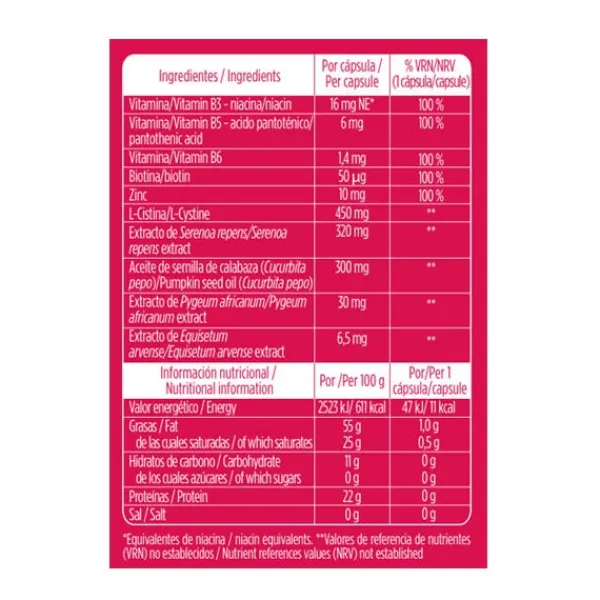 Alimenta tu cabello desde el interior. Lambdapil 5α Plus cápsulas es un complemento alimenticio formulado con Serenoa repens, Cucurbita pepo y Pygeum africanum, extractos de plantas específicos para el cabello. Además, su fórmula incluye también vitaminas del grupo B (como Biotina), Zinc, L-Cistina y extracto de Equisetum arvense.
