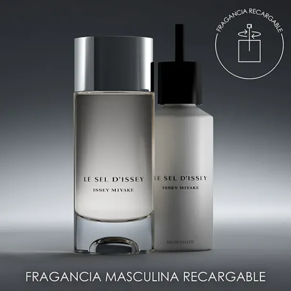 • Disponible en tamaños de 50 ml y 100 ml, Le Sel d’Issey es recargable con un formato de 150 ml.