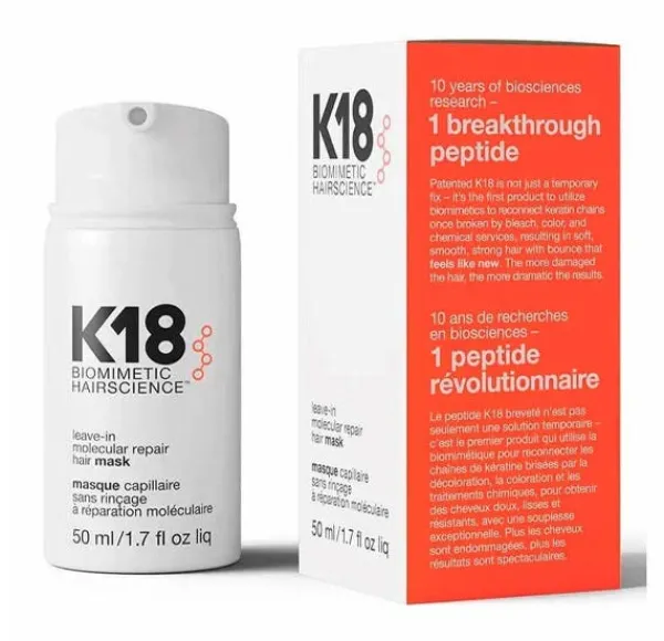 La Mascarilla Capilar Reparadora Molecular Profesional de K18 es un producto innovador compuesto por un principio activo patentado único en el mercado: el Péptido K18. ¡Este péptido protege y reparará el cabello en solo 4 minutos!
