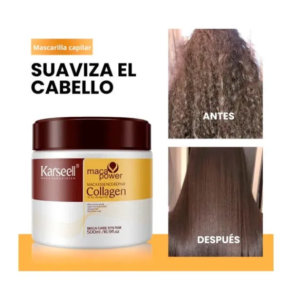 La Mascarilla capilar Karseell te deja el pelo suave, brillante y con un aroma que te transporta a un jardín de flores y frutas. Si tienes el pelo seco y/o dañado, ¡ no te preocupes ¡, nuestra mascarilla con colágeno activo es la solución. Contiene aceite de argán marroquí, muy conocido por sus propiedades nutritivas y reparadoras, y colágeno activo, el ingrediente estrella para una reparación profunda, además de esencia de maca y ácido hialurónico.