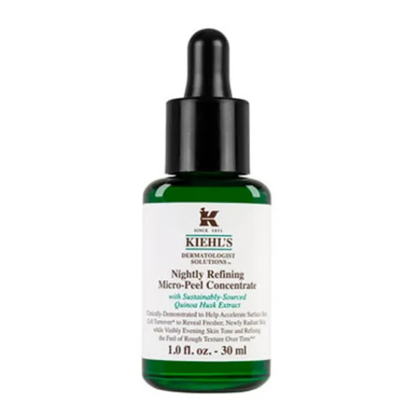 El exfoliante facial de noche Nightly Refining Micro-Peel Concentrate de Kiehl's ayuda a afinar la piel con textura áspera y devuelve una piel fresca y con un nuevo brillo.