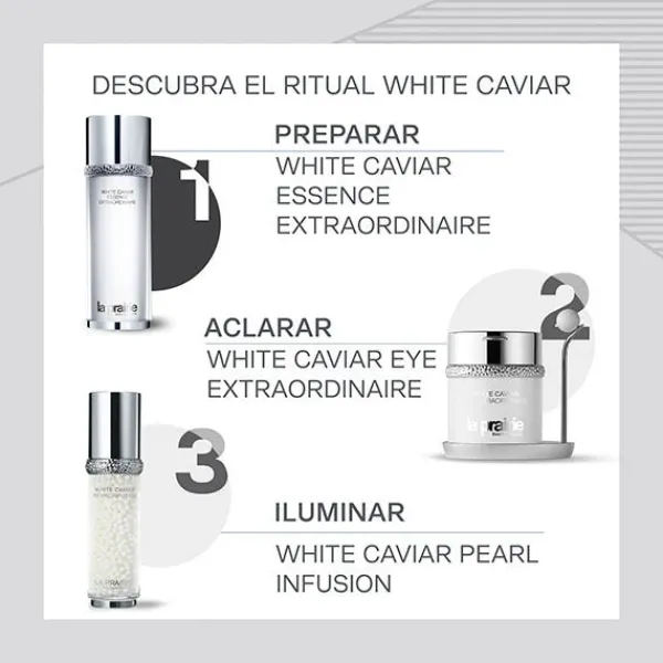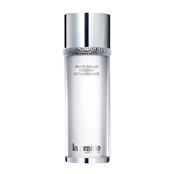 La loción iluminadora White Caviar Essence Extraordinaire de La Prairie está enriquecida con la exclusiva molécula Lumidose, que ayuda a reducir las imperfecciones cromáticas de la piel y la ilumina, mientras que el Extracto de Caviar dorado y de agua de caviar nutren y protegen la piel proporcionando una sensación de suavidad y firmeza extraordinarias.