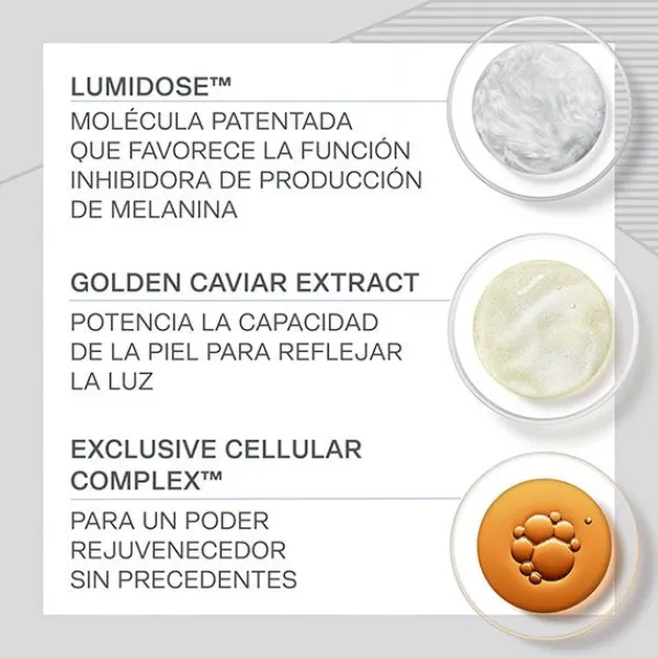 • Enriquecida con los extractos más potentes y exclusivos del caviar que nutren la piel, la ayudan a aumentar su producción de colágeno y a recuperar su densidad potenciando así su luminosidad.