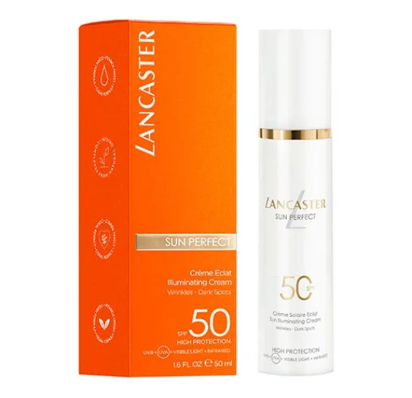 La evolucionada fórmula de Sun Perfect Sun Illuminating Cream SPF50 ofrece la exclusiva y avanzada tecnología Full Light de Lancaster, que actúa frente al 100 % del espectro solar*, junto con la tecnología antiedad, el sistema de reparación solar de origen natural y el complejo potenciador de luminosidad.